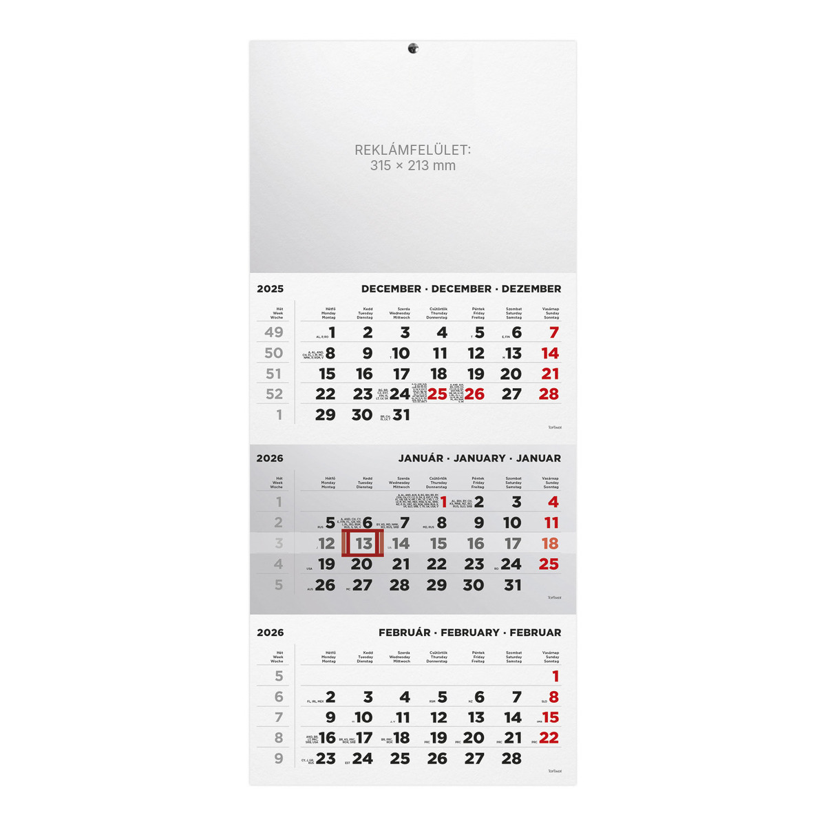 T072, 1 tömbből álló 3 havi speditőr naptár - Üres, nyomtatható fejrésszel